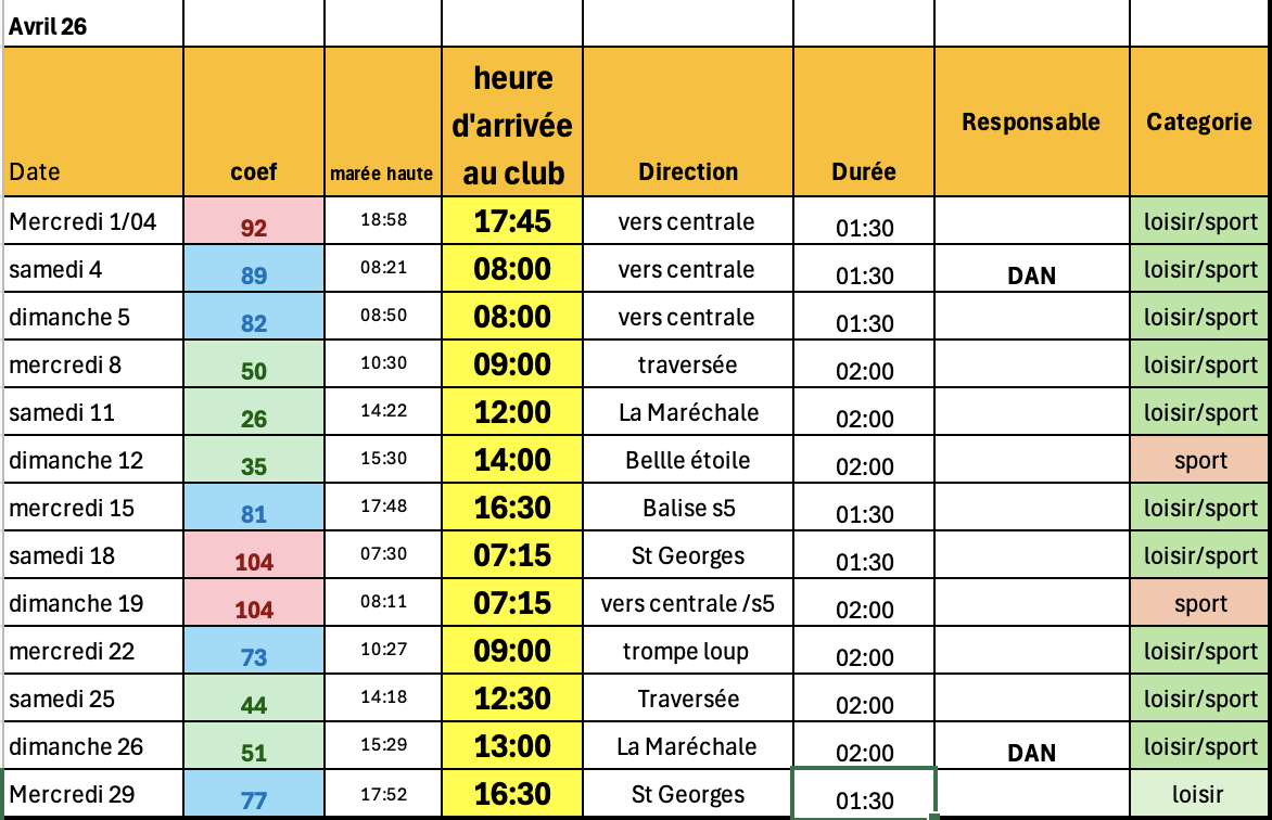 *En l’absence de responsable désigné à l’avance, la sortie est possible pour les membres, mais nous devons savoir qui part et qui sera responsable du bateau.